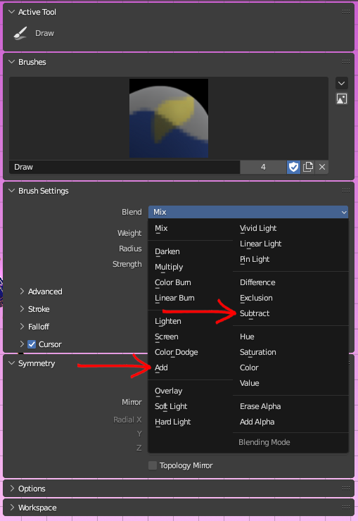 Before you start editing, to have you weight paint automatically mirrored as you paint, toggle Mirror Vertex Groups and select X in Mirror under Symmetry (in Blender 3.4.0) To edit the influences, select the vertex group one you want and, in the Tool menu, under Blend, switch between Add and Subtract according to your needs. You can also change the size, weight and strength of the brush.