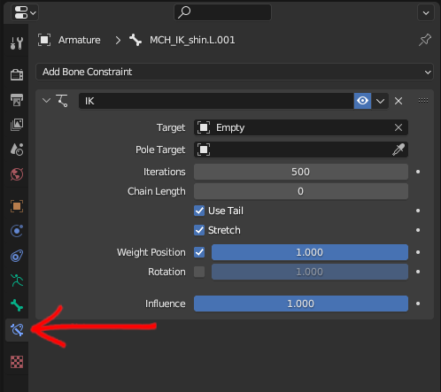 In Pose Mode, click on the shin bone, press CTRL+Shift+C and select Inverse Kinematics. It will look all messed up, but don’t worry, it will be fixed once you change a few settings. With the shin selected, got to the Bone Constraint Properties as shown below.
