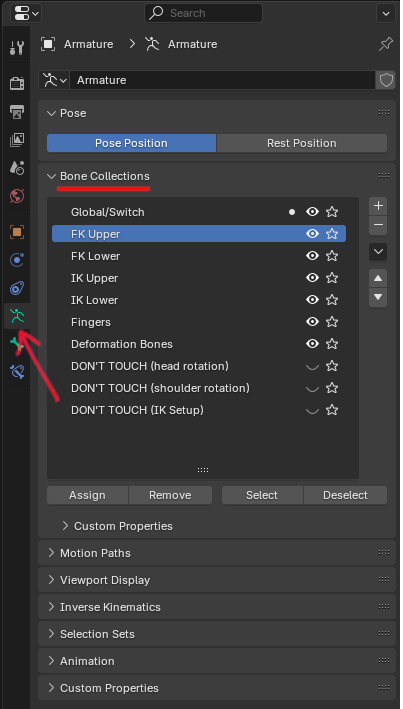To avoid any accidents and to make it easier to identify the controls, this rig is organized in bone collections that can be accessed in the Data Properties tab in Blender. These collections’ visibility can be toggled on and off by clicking on the Eye Icon. By default, they are all visible, except for the DON’T TOUCH ones.