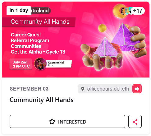 Events can also be hosted in Worlds—attending them you can make friends and explore! Below is an example of an event hosted in a World. By the ruby ‘jump in’ arrow, you can see the World’s name in place of Genesis City coordinates.